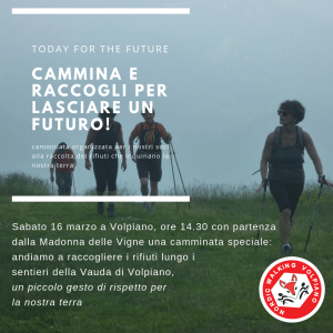 Il Nordic Walking Volpiano si associa ai giovani che oggi manifestano in difesa dell’ambiente; per solidarietà alle loro iniziative indice per la giornata di domani, sabato 16 marzo, una camminata di raccolta rifiuti in Vauda.