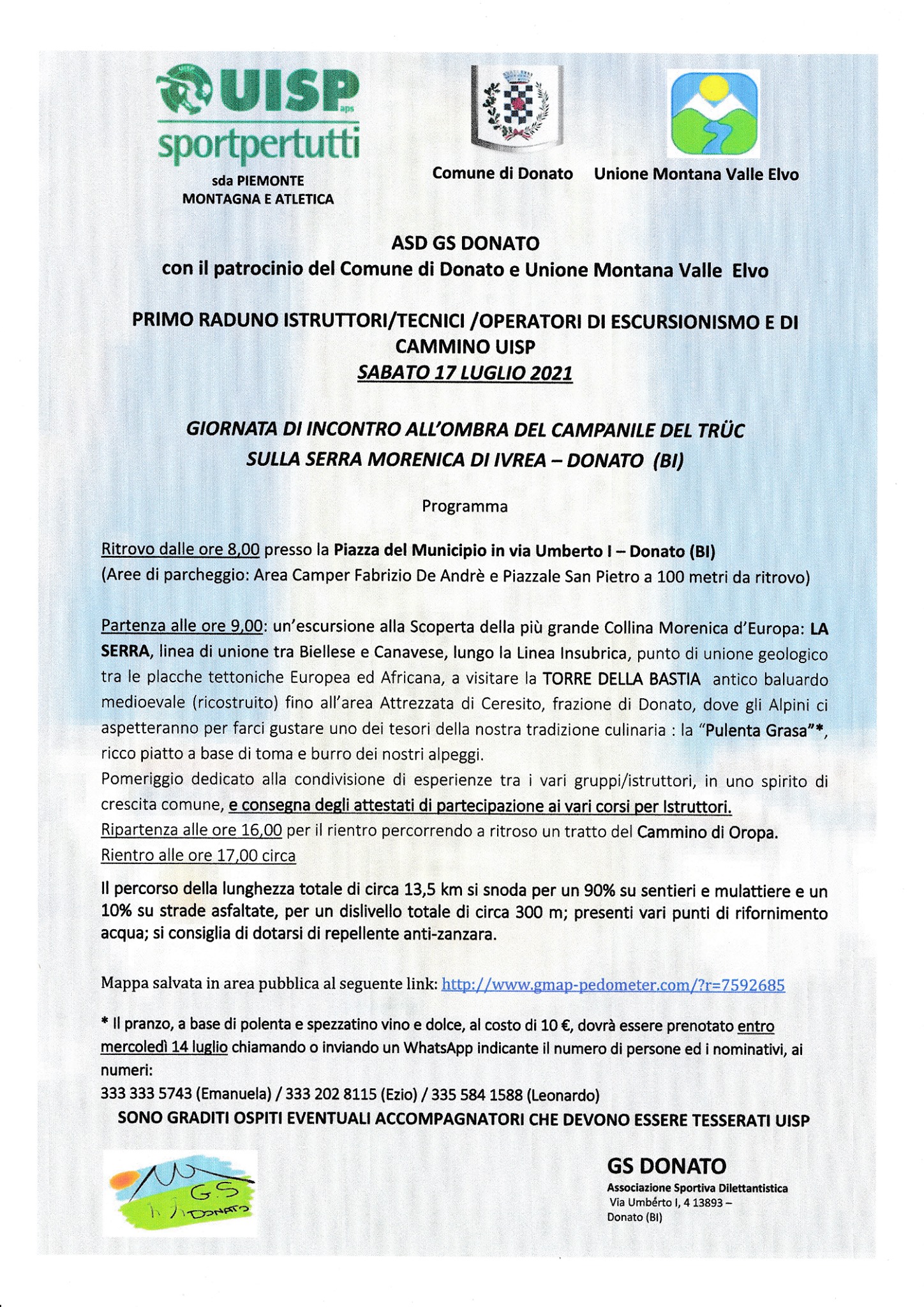 Sabato 17 Luglio, a Donato (Bi), l’Asd Gs Donato ha organizzato un evento per incontrare gli istruttori di escursionismo e di cammino Uisp. Il nordic walking volpiano sarà presente con i suoi istruttori ed ha piacere di condividere questa giornata con i propri soci. Il programma prevede una camminata di circa 13km, alla scoperta della Collina Morenica, La Serra.