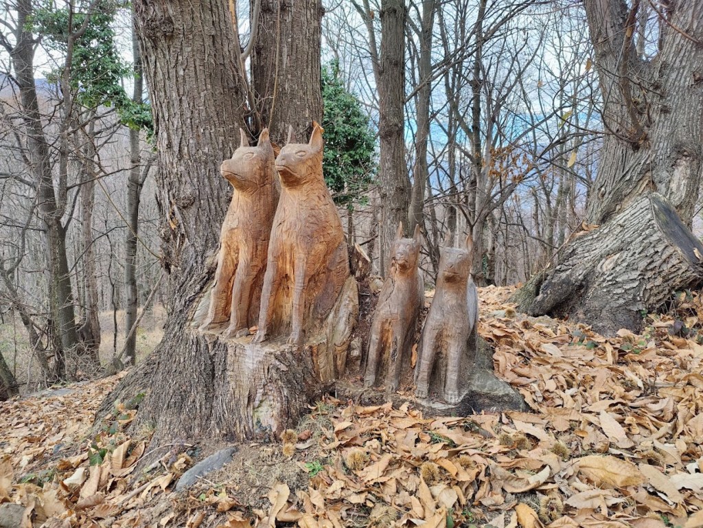 Oltrepassata la borgata il sentiero ci condurrà presso un area boschiva dove abili intagliatori hanno scolpito sui tronchi di alberi abbattuti numerosi animali del bosco.