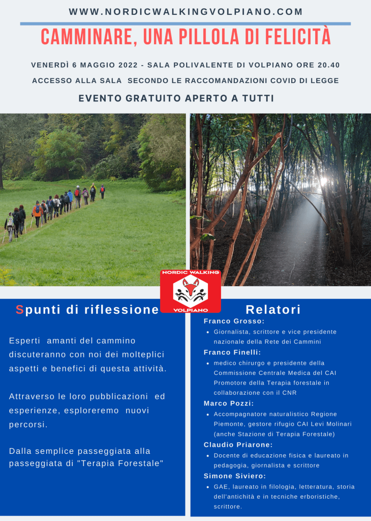 CAMMINARE, UNA PILLOLA DI FELICITA’ venerdì 6 maggio 2022 – ore 20.40 presso la sala polivalente di Volpiano