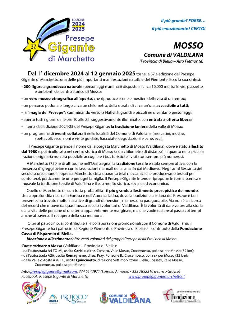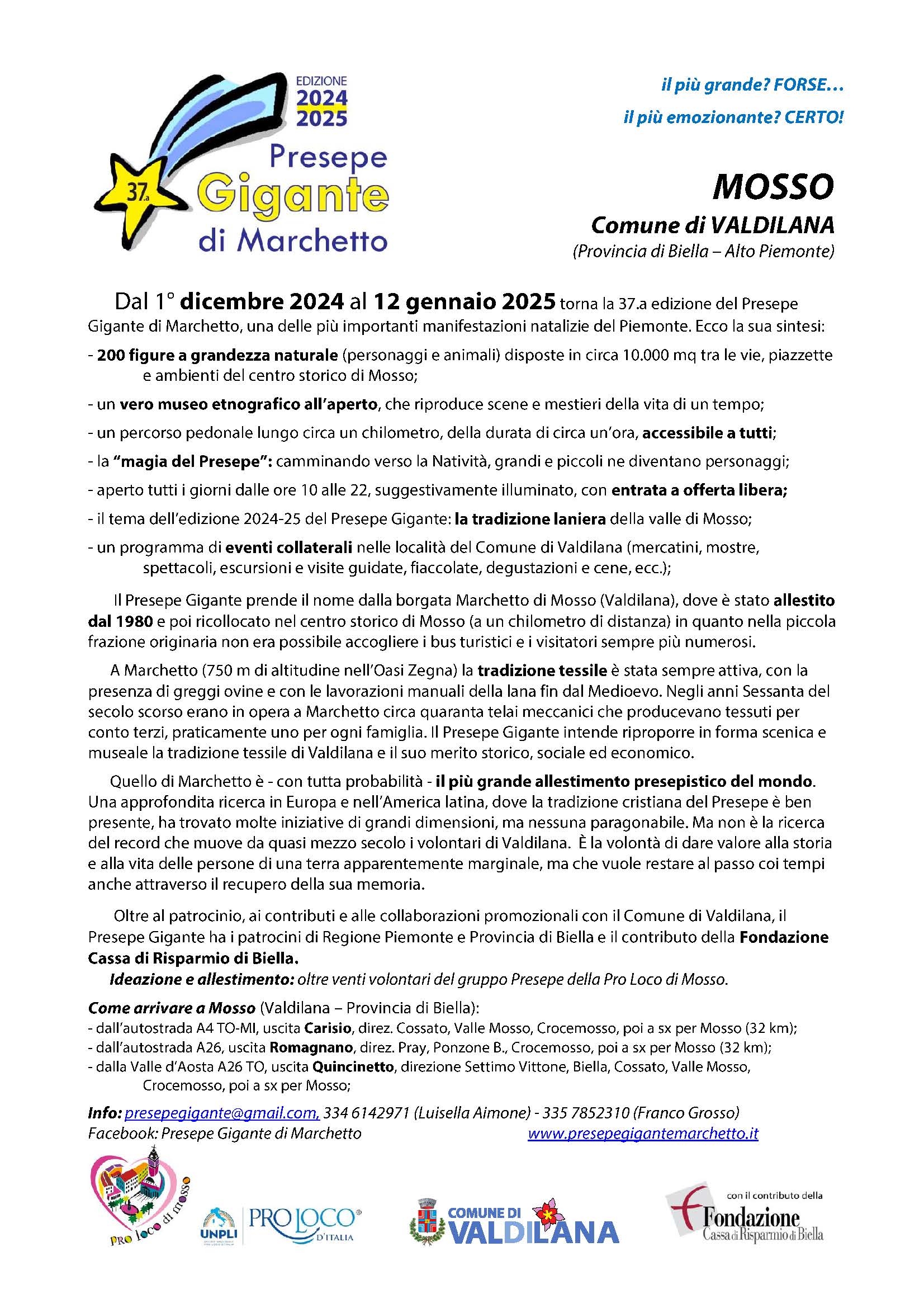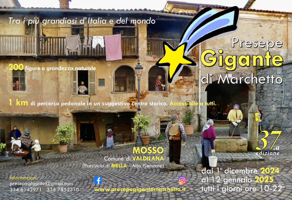 Il presepe gigante di Marchetto, situato a Mosso, una frazione di Valdilana in provincia di Biella, è uno dei presepi all’aperto più affascinanti e suggestivi d’Italia. Ogni anno, durante il periodo natalizio, il borgo si trasforma in un vero e proprio museo a cielo aperto, ospitando centinaia di figure a grandezza naturale, creando un’atmosfera magica che attira visitatori da ogni dove.