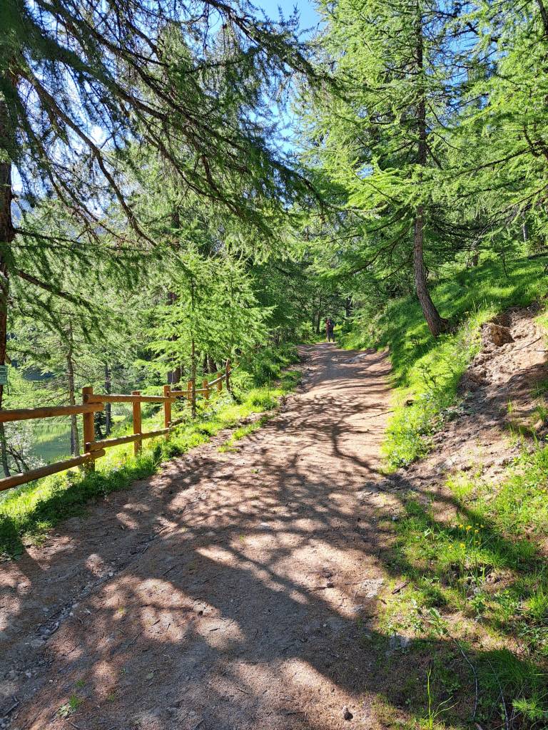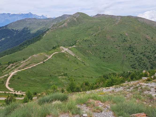 A metà della piana abbandoniamo la strada in prossimità di un ponte (cartelli indicatori) e proseguiamo luno il sentiero 605 che risale in direzione Sud, tra verdi prati ricchi di fiori (e stelle alpine), la sinistra idrografica del torrente Gran Miol, mantenendoci ad alcune decine di metri a monte in posizione estremamente panoramica.