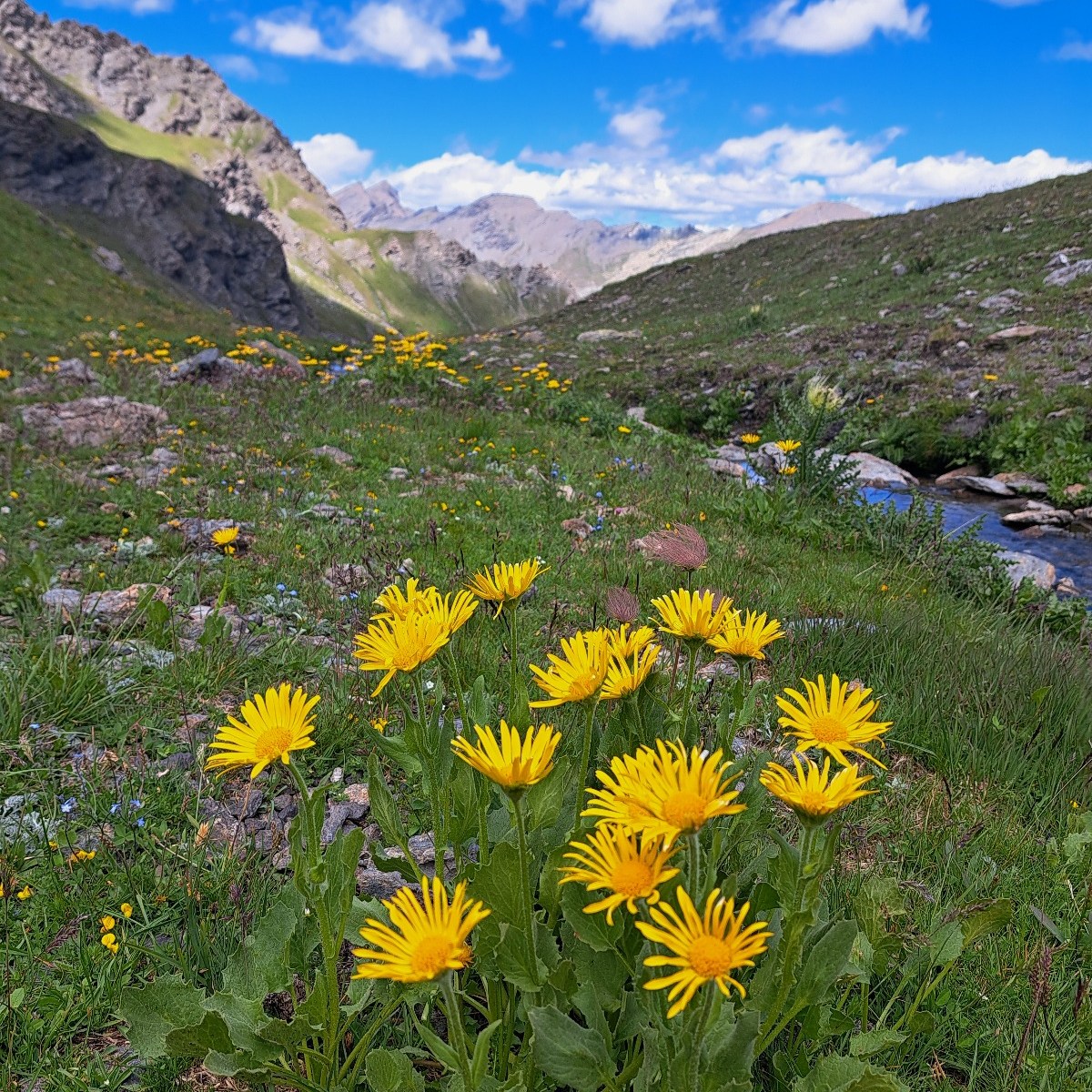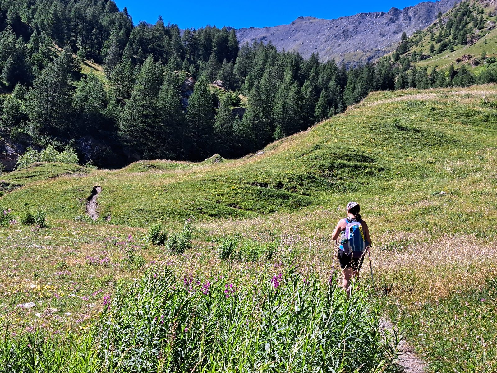 A metà della piana abbandoniamo la strada in prossimità di un ponte (cartelli indicatori) e proseguiamo luno il sentiero 605 che risale in direzione Sud, tra verdi prati ricchi di fiori (e stelle alpine), la sinistra idrografica del torrente Gran Miol, mantenendoci ad alcune decine di metri a monte in posizione estremamente panoramica.