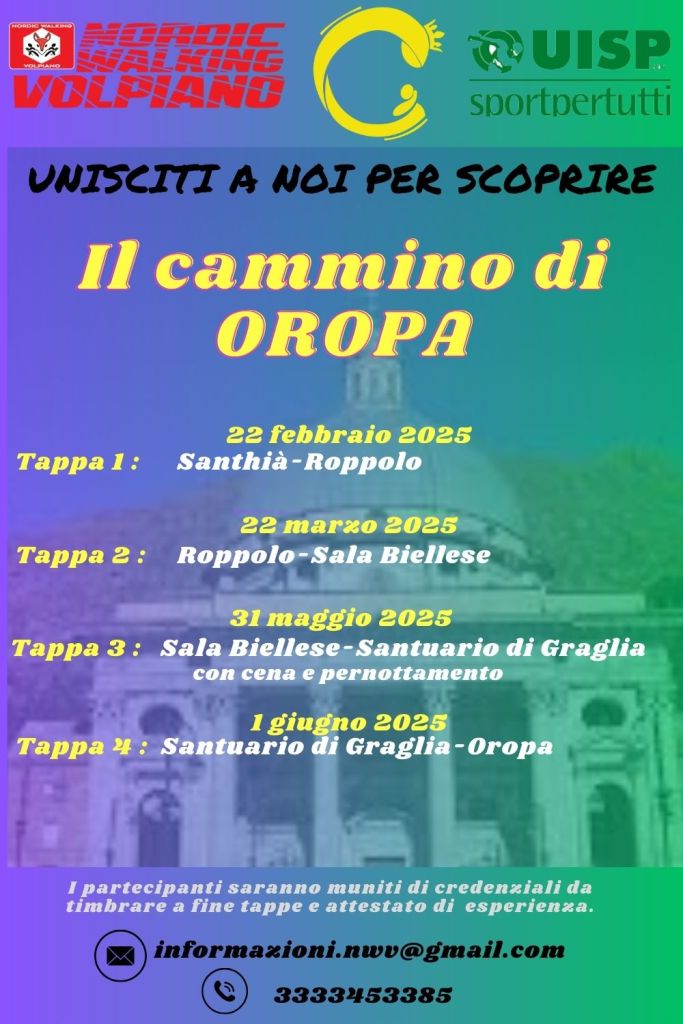 Il Cammino di Oropa della Serra, lungo 62 km, รจ stato ideato nel 2012 da Alberto Conte, presidente dellโAssociazione Movimento Lento e della Casa del Movimento Lento di Roppolo, che tuttora lo sostiene e lo promuove in prima persona, collaborando con associazioni locali, in primo luogo lโAssociazione degli Amici della Via Francigena di Santhiร e con il Santuario di Oropa. Il cammino รจ segnalato con una freccia gialla su sfondo nero che indica la direzione di Oropa.